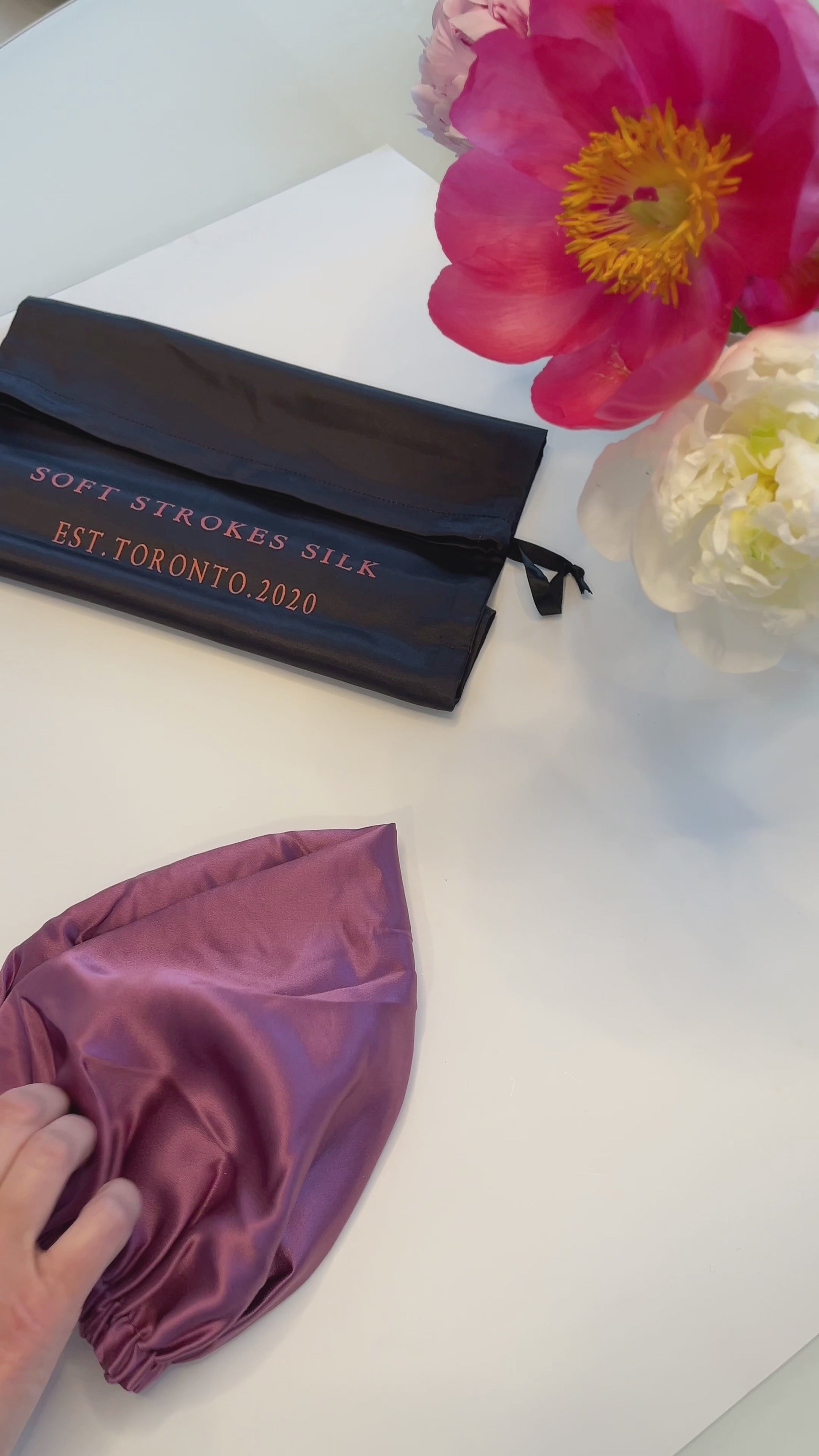 This bonnet is lined with silk to ensure the smooth side of silk charmeuse is touching your hair. We selected contrasting colours so it's fun to wear!